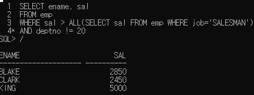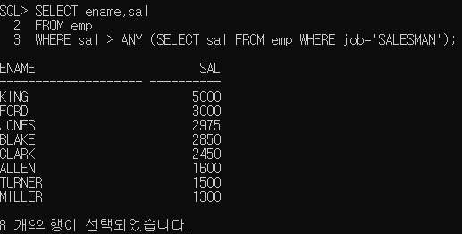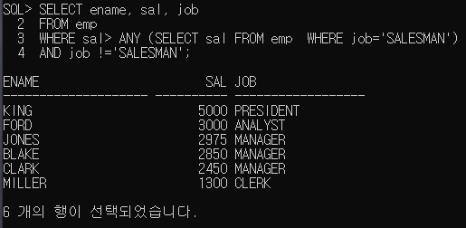 5. 직책이 'SALESMAN' 보다 급여를 많이 받는 사원들의 이름과 급여를 출력하라. (ANY 연산자 이용)
