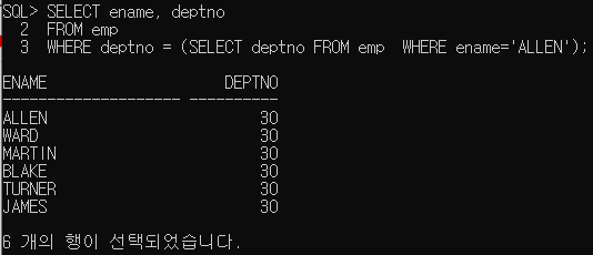 'ALLEN' 과 같은 부서에서 근무하는 사원의 이름과 부서의 번호를 출력해 보세요.