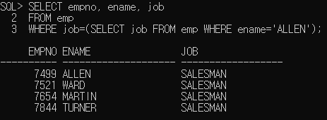 'ALLEN' 과 동일한 직책(job) 을 가진 사원의 사번과 이름, 직책을 출력해 보세요.