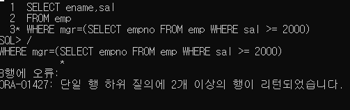 다수의 행이 SELECT 되기 때문에 단일행 서브쿼리에서는 동등연산자를 사용할 수 없다.