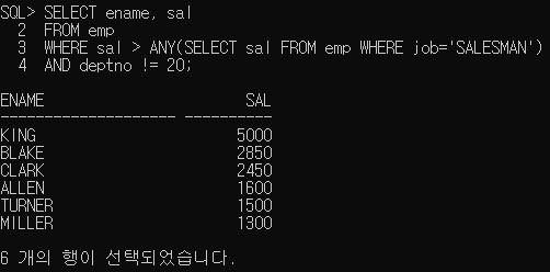 5. 직책이 'SALESMAN' 보다 급여를 많이 받는 사원들의 이름과 급여를 출력하라. (ANY 연산자 이용)