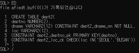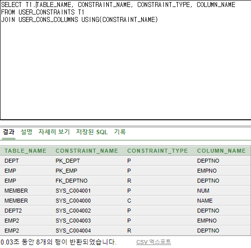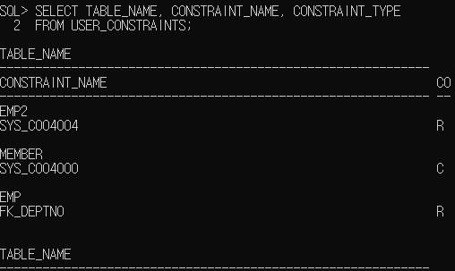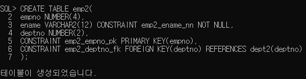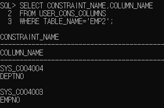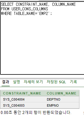 제약 조건의 이름을 미리 지정할 수 있는데 EMP2와DEPT2 같은 경우 NOT NULL등과 같은 제약조건을 입력할때 이름을 정해놓지 않았기 때문에 시스템에서 임의로 정해준다. 예시에서는 SYS_C004002 등의 이름이 지정되었다.