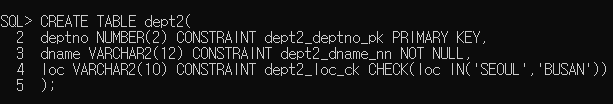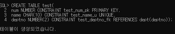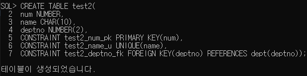 1번 방식과는 다르게 2번 방식은 table 기본 조건을 만든 다음에 제약조건을 작성한다. 여기서 작성 위치를 지정해놔야 작동하기 때문에 제약조건 뒤에 괄호를 만들고 칼럼명을 적어야한다.