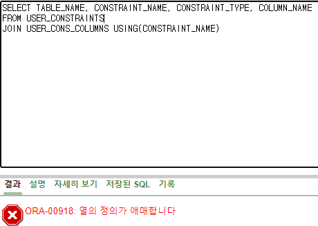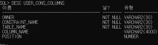제약조건인 붙은 COLUMNS의 데이터를 확인하려면 USER_CONS table을 참고해야한다.