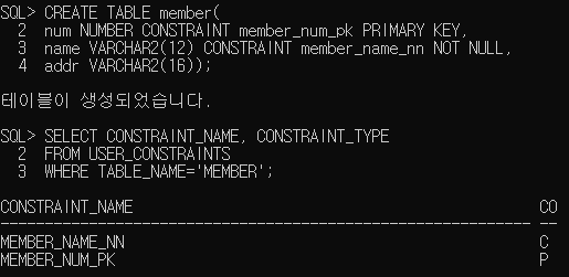 테이블을 만들때 CONSTRAINT 제약조건명 제약조건을 입력해서 제약조건 이름과 제약조건을 설정했다.