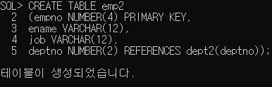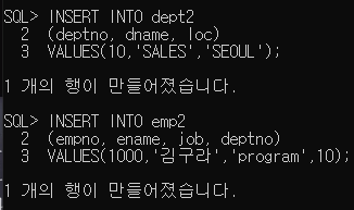 두 TABLE이 REFERENCES 한 상태이기 때문에 dept2에서 deptno(부서번호) 10 데이터를 미리 만들어줘야 emp2에서도 deptno 10의 데이터를 입력할 수 있다.