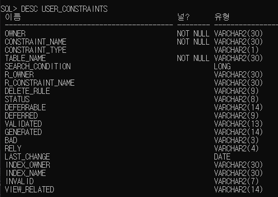 제약조건을 확인하는 방법은 DESC USER_CONSTRAINTS 이다.