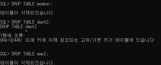 dept2 table은 emp2 table과 REFERENCE 되어있기에 삭제가 되지 않는다. 이때 emp2 부터 삭제한 후 dept2를 삭제해준다.