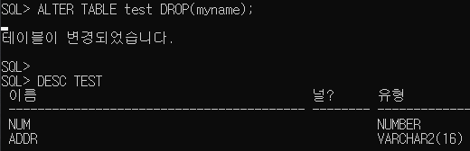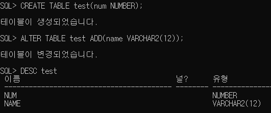 sql>ALTER TABLE test ADD(name VARCHAR2(10));