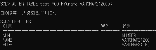 sql>ALTER TABLE test MODIFY(name VARCHAR2(20));