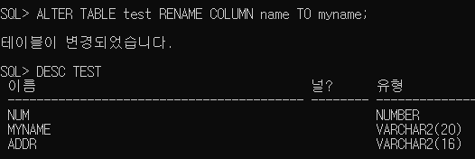 ALTER TABLE RENAME COLUMN TO 를 사용해서 칼럼 이름을 변경했다.