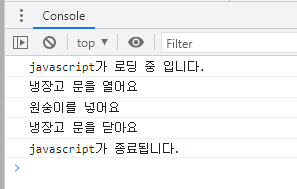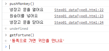 예제의 pushMonkey는 동작은 하지만 값은 undefined가 나오듯이 결과값이 나오지는 않는다. 반면에 getFortune은 let과 return을 활용하여 결과값이 나오게 설정하였다. 위의 html을 실행시키면 위 사진과 같은 console창이 실행된다.