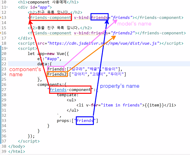 props 이름이 camel case 로 작성되어 있으면 kebab case 로 props 를 전달해야 한다.